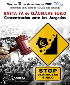 Mañana, martes 11 de diciembre, a las 11.00 horas, la Plataforma Hipotecaria de ADICAE llevará a cabo acciones de denuncia y reivindicación, frente a los juzgados de diversas ciudades españolas, para protestar contra las cláusulas suelo, el retraso judicial y el boicot bancario al que las entidades están sometiendo el proceso.