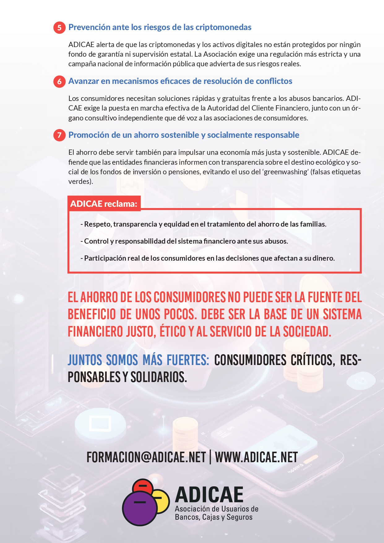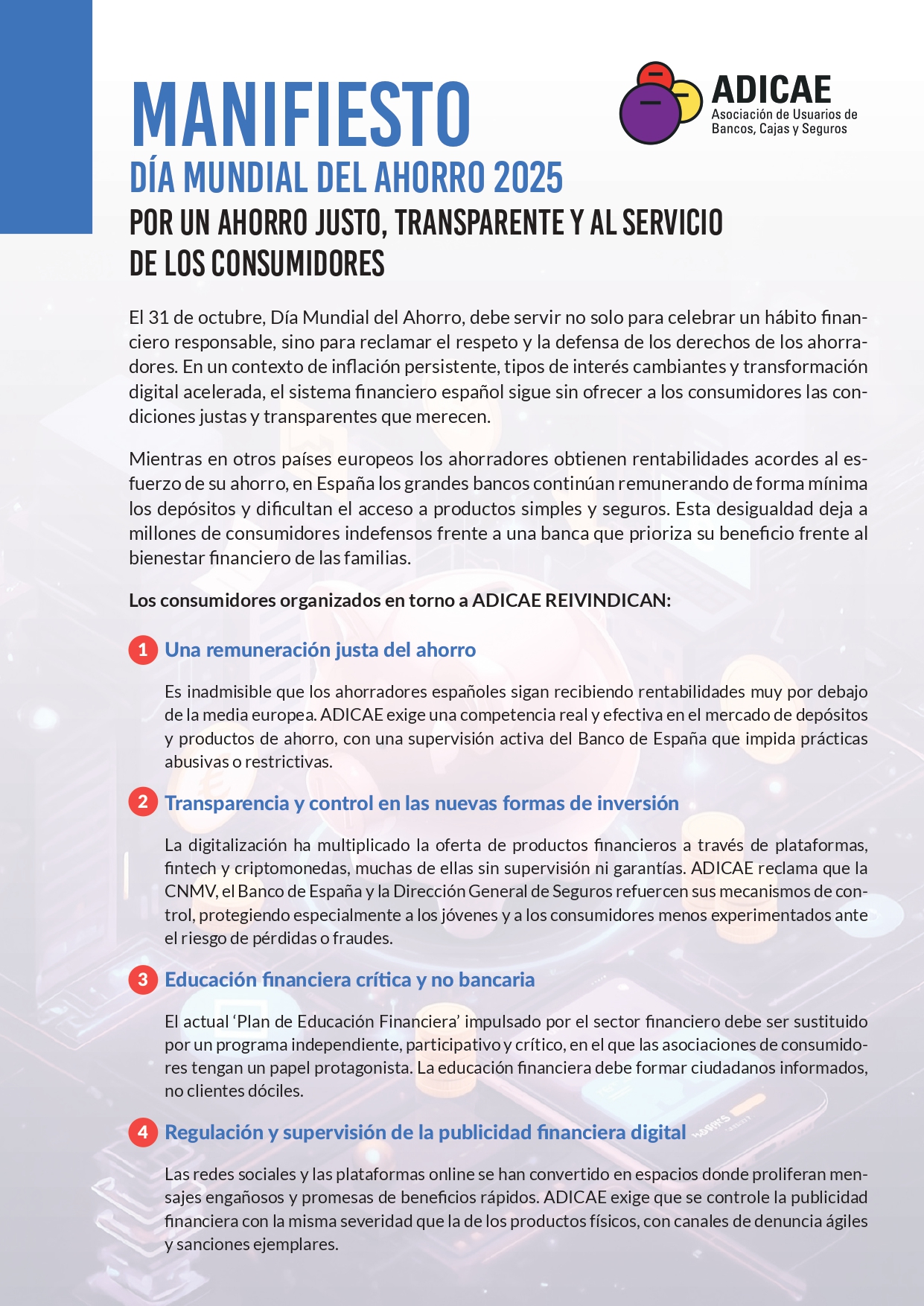 Aquí el Manifiesto de ADICAE del Día Mundial del Ahorro junto las reivindicaciones de los consumidores y la asociación: