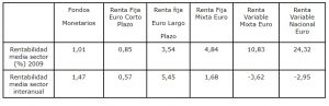 Destacamos la evolución de la renta variable nacional euro, que con un 24,32% es la que mayor rentabilidad acumulada registra. No obstante también hemos de tener en cuenta que en términos interanuales es negativa, ello indica que las rentabilidades negativas acontecidas durante 2008 no son compensadas con los datos positivos de 2009; al igual que en la renta variable mixta euro. Este tipo de fondos es el que mayores rentabilidades arrojan, por contra también son los que implican un mayor riesgo debido a la incertidumbre asociada a los mercados bursátiles.