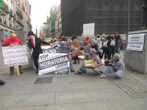 Entre las acciones realizadas cabe destacar la performance realizada en Madrid, en la que cientos de consumidores han querido dejar claro su malestar con las entidades financieras y con las medidas aprobadas por el Gobierno en materia hipotecaria. En la madrileña Puerta del Sol se ha escenificado el abusivo proceso de contratación de una hipoteca y los riesgos de la ejecución hipotecaria y el posterior lanzamiento -desahucio-, llevándose a cabo un embargo y desahucio simbólico de ‘El oso y el madroño’ -fotografía de la derecha-, la fuente de la Puerta del sol y otras instituciones cercanas a la plaza. Un banquero, un notario y cuatro ‘reos’ hipotecados han dado vida a la injusticia y abuso del que son víctimas cientos de miles de familias, y que concluye con la expulsión de la vivienda.