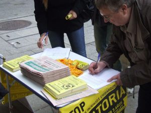 El último ejemplo de confusión es el del subsecretario de Economía y Competitividad, que no sólo ofrece cifras erradas sobre el número de desahucios estos últimos 4 años, sino que lanza la falsa amenaza de que adoptar medidas eficaces y reformar la legislación hipotecaria a fondo supone una inducción a la “cultura del impago”, mientras en sendos comunicados la CECA y la AEB mienten sin pudor alguno sobre su actuación hasta ahora y sus propósitos. A la derecha un instante de la recogida de firmas en Madrid.