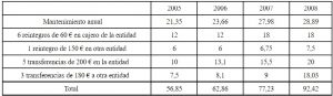 Con un pequeño tratamiento de datos, se puede comprobar cómo ha ido aumentando con el tiempo el coste por efectuar unas típicas operaciones bancarias. La siguiente tabla muestra, entre los años 2005 y 2008, cómo las comisiones se han encarecido continuamente para una serie de operaciones relacionadas con las transferencias bancarias y la tarjeta de crédito.